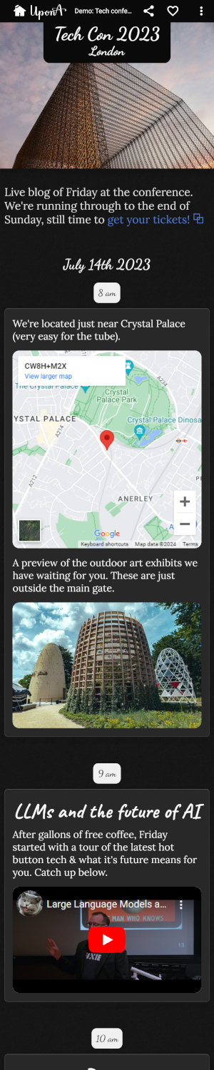 Add anything from social media posts, through rich text to maps & YouTube videos.